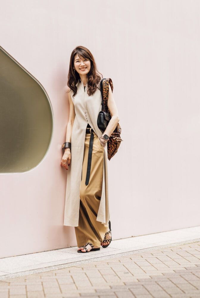 ベージュベースのシンプルな装いに少量の黒を効かせたかっこいいスタイリングが印象的です。「縦長のすとんとしたIラインシルエットなので、あえて長いベルトを見せて、メリハリをつけました。服がシンプルなので、髪はまとめずにふんわりさせて、華やかさを出しています」