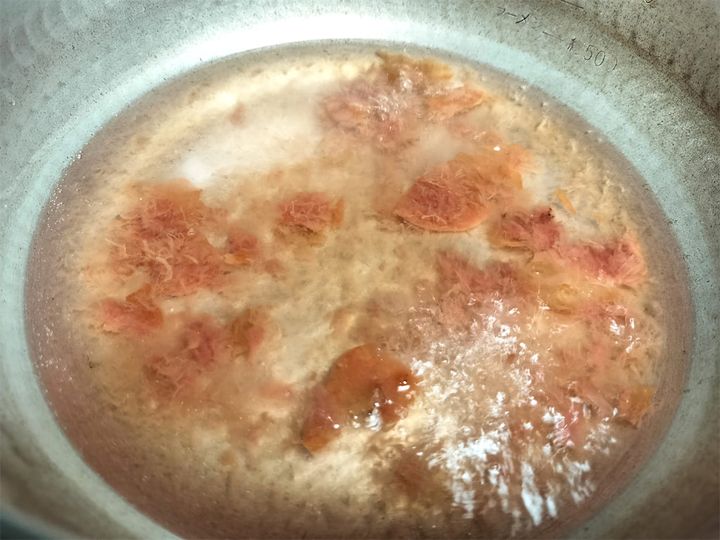 1. 鍋に酒と梅干しを入れて弱めの中火にかけ、梅干しをほぐします。