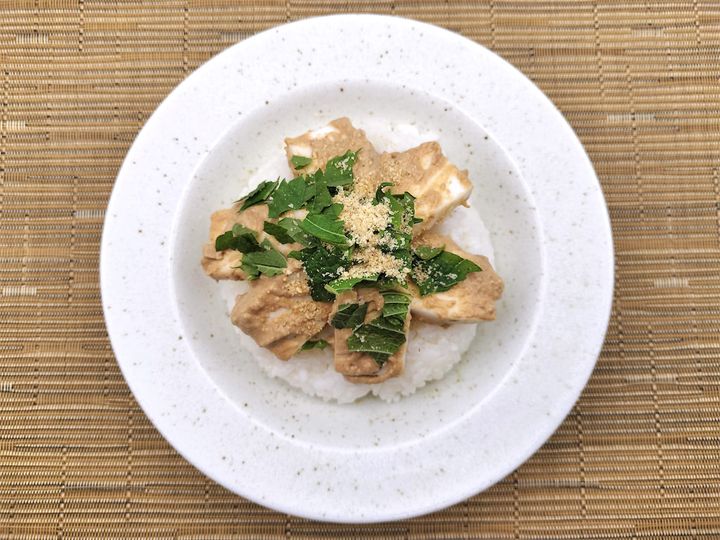 7. 器にご飯を盛り付け、はんぺんを6のゴマだれにからませて乗せます。青じそをちぎって散らし、白ゴマをふって出来上がりです。
