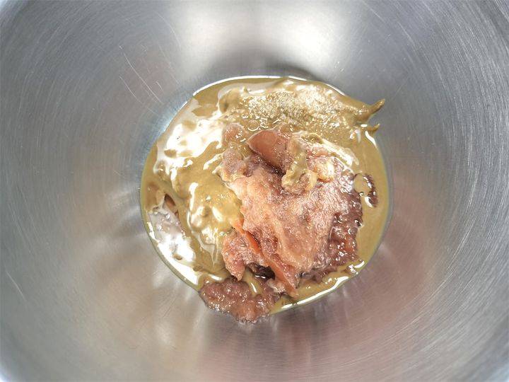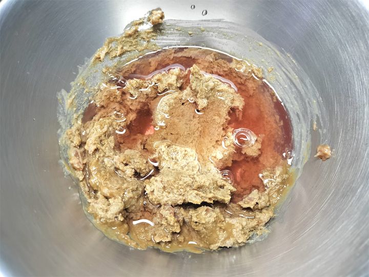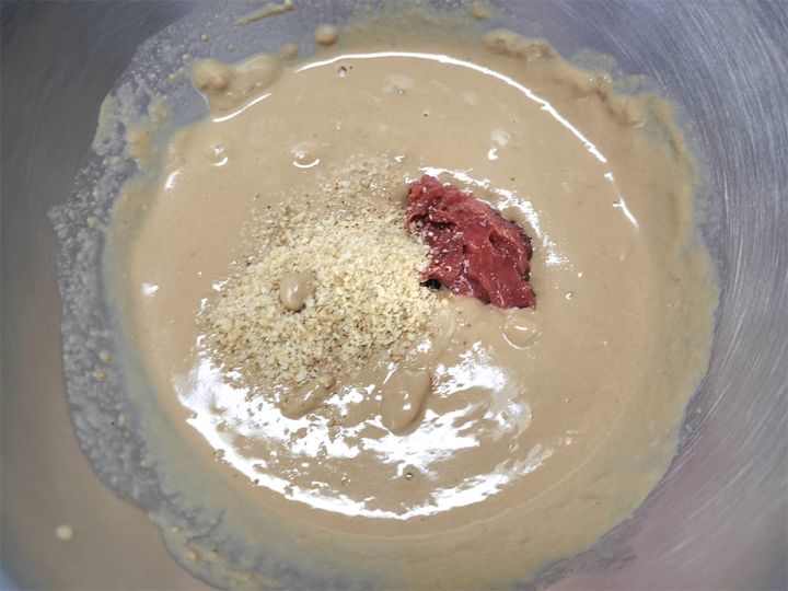 4. ボウルに練りゴマを入れ、濾して残った梅干しを加えてよく混ぜます。