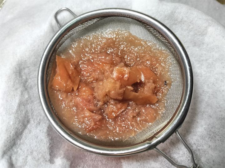 3. ザルにキッチンペーパーを敷いて2を濾します。濾してできた液体は「煎り酒」と呼びますが、後で使いますので捨てないでください。