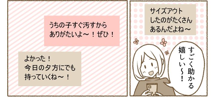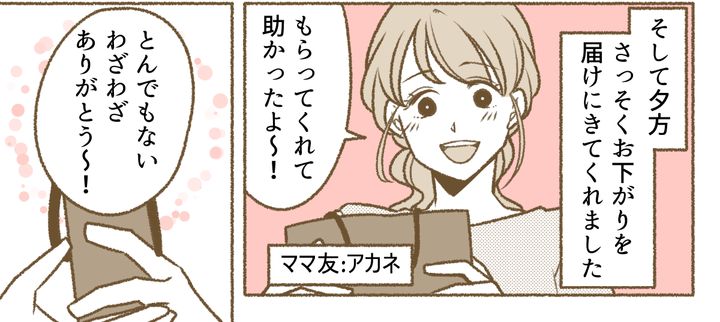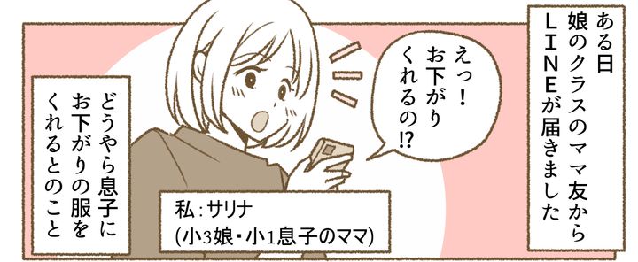 私はサリナ。夫と2人の子ども(小3の娘ホノカ、小1の息子トウヤ)の4人家族です。子どもたちは2人とも外遊びが大好きで、元気いっぱい。さてある日のこと、娘のクラスで知り合ったママ友・アカネさんからLINEがきました。なんと息子にお下がりをくれるのだそう。うちはきょうだいの性別が違うだけでなく好きな服の系統も違うため、下の子にお下がりをあげることがほとんどできません。だからこうして譲ってもらえるのはとてもありがたいことです。