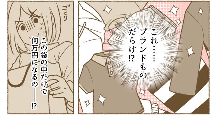 私は思わず正座すると、紙袋から服を1枚1枚取り出して状態を確認しました。どれもとても綺麗で、新品と言われても納得する程です。私は大量のブランド服を前にして、ひとりで動揺してしまいました。