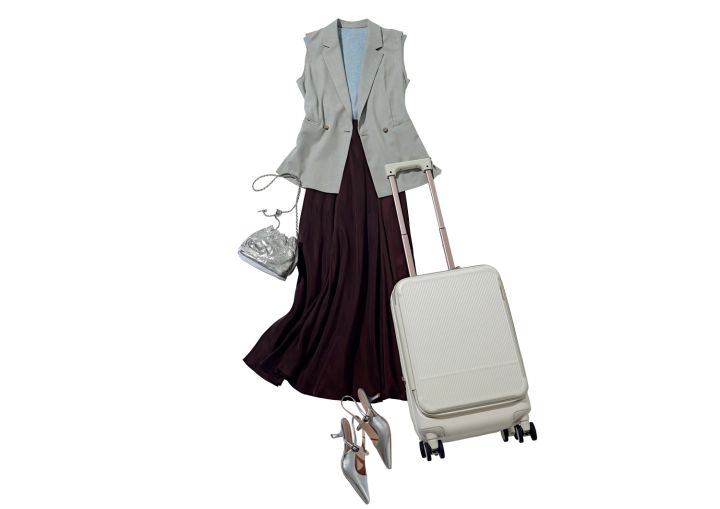 ラメアンサンブル(ニット)¥18,700/アルページュストーリー ジレ¥6,490/ロペピクニック(ジュン) 茶スカート¥25,300/カデュネ シルバーバッグ¥5,390/カシュカシュ(アンビリオン) シルバーパンプス¥18,700/Stola. キャリーケース¥41,800/ジュエルナローズ(ジュエルナローズ新宿サブナード店)