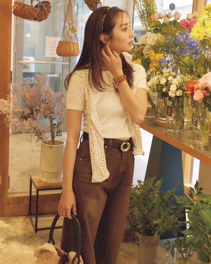 Tシャツ¥17,600(FLORE FLORE/マルティニーク ルミネ横浜)パンツ¥19,800(Le L’ESSENCE/ラ トータリテ 有楽町マルイ店)肩にかけたカーディガン¥15,180(PISCESS/JACK of ALLTRADES pressroom)ベルト¥16,500バッグ¥27,500ネックレス¥19,800 (すべてJAMIRAY/エルディスト ショールーム)バッグにつけたサングラス¥48,400(アイヴァン/アイヴァン 東京ギャラリー)靴¥28,600(クラークスオリジナルズ/クラークスジャパン)カチューシャ¥16,500(アレクサンドル ドゥ パリ/アレクサンドル ドゥ パリ GINZA SIX店)バングル¥31,900(CXC/アマン)リング[人差し指]¥31,900(les bon bon/フーブス)リング[中指]¥29,700リング[小指]¥66,000(ともにアルティーダ ウード)