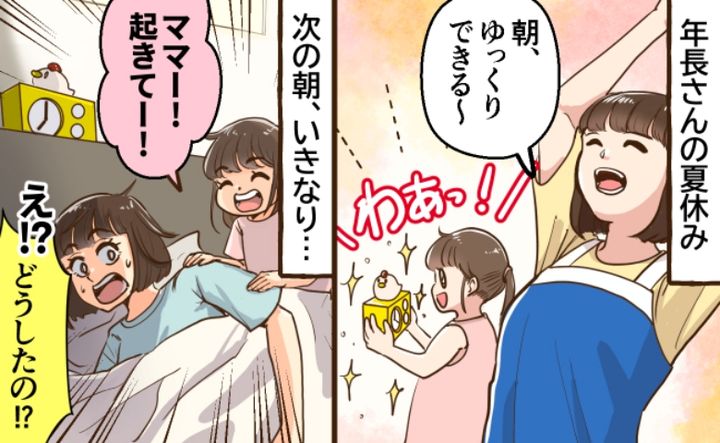 年長さんになる子どもと過ごした、夏休みのお話です。幼稚園のあるときは誰よりも早く起きてお弁当作りや家事をこなす日々を過ごしていたので、夏休みに入りやっと少しだけ朝はゆっくりできる! と思っていたのですが……。