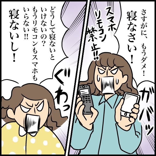 我慢の限界がきた私は「さすがにもうダメ!寝なさい!」とつむぎからスマホとテレビのリモコンを取り上げました。つむぎは「どうして寝ないといけないの?もうリモコンもスマホもいらない!!寝ないし!!」と逆上して寝ない宣言をしてきました。