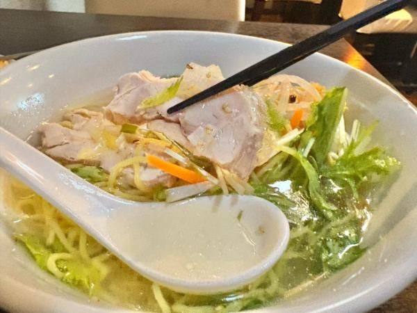 続いて、冷し鶏そばも到着。まずはスープをひとくち。