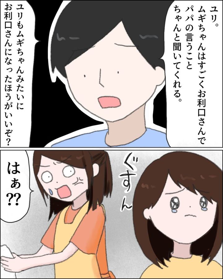 すると、「ユリ。ムギちゃんはすごくお利口さんで、パパの言うことちゃんと聞いてくれる。ユリもムギちゃんみたいにお利口さんになったほうがいいぞ?」呆れたように言う夫の言葉を聞いて、ぐすんと涙ぐむユリ。それを聞いて「はぁ??」と怒りがこみ上げました。