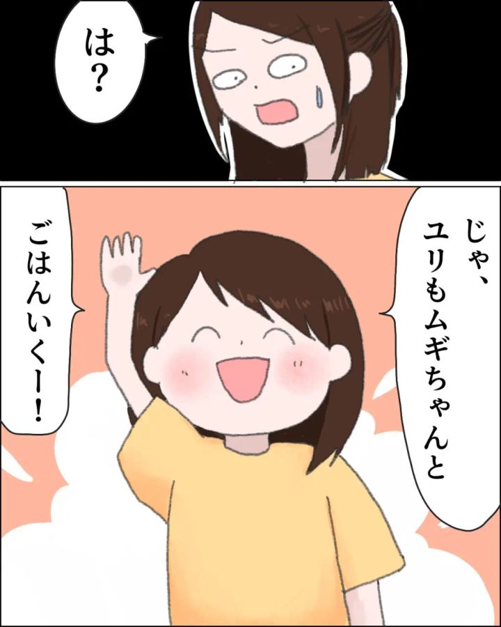 「は?」と呆れながら答えると、「じゃ、ユリもムギちゃんとごはんいくー!」とユリが言い出しました。