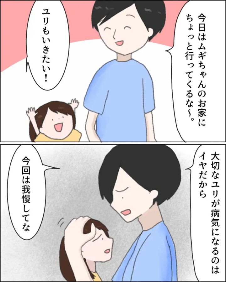 そして、「今日はムギちゃんのお家にちょっと行ってくるな~」夫がそう言うと、「ユリもいきたい!」と言い出すユリ。すると「大切なユリが病気になるのはイヤだから、今回は我慢してな」と言いました。