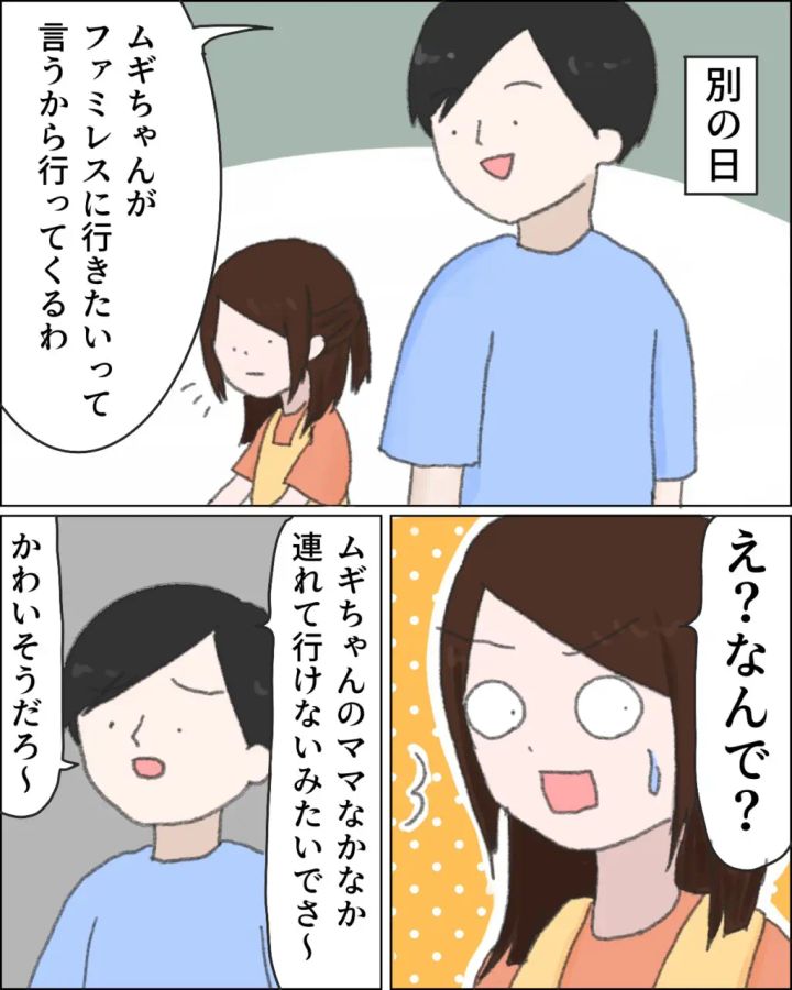 「ムギちゃんがファミレスに行きたいって言うから行ってくるわ」夫の言葉に「え?なんで?」と答えると、「ムギちゃんのママ、なかなか連れて行けないみたいでさ~。かわいそうだろ~」と言う夫に、