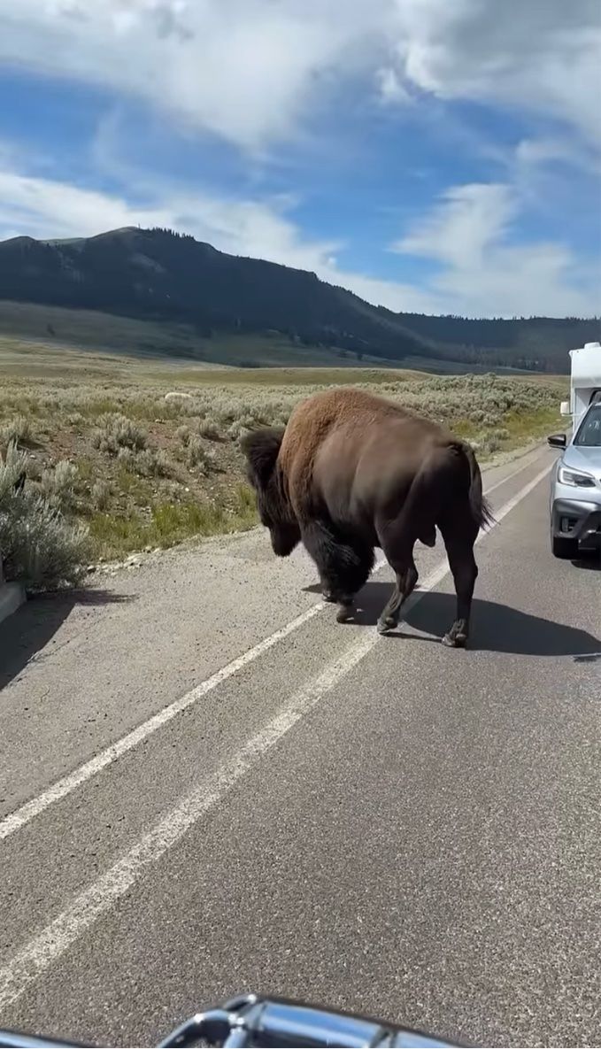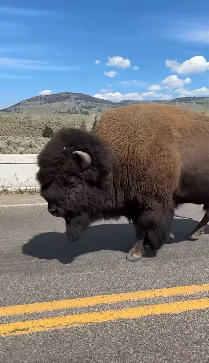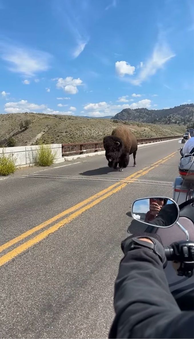 動画の舞台は、アメリカの名所・イエローストーン国立公園。 バイクに乗っていた撮影者さんたちの前に現れたのは、この地を象徴する迫力満点な動物でした。
