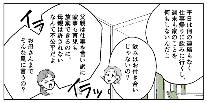 母も働いていますが、ずっとパート勤務で家のことはほとんど母1人でやってきました。家庭に無関心で、家事も育児も協力してくれない夫への怒りに母も共感してくれるかと思いきや、母は夫の肩を持つようなことを言います。そんな母にも、私はついイライラしてしまいました。