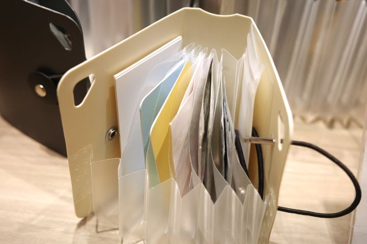 サイズ感がとっても絶妙で、文具の整理にはもちろん、薬やコスメの試供品、調味料、カード、レシートなど、ついついばらばらになってしまいがちな小物をガバっと開くじゃばら式ポケットにまとめられます。