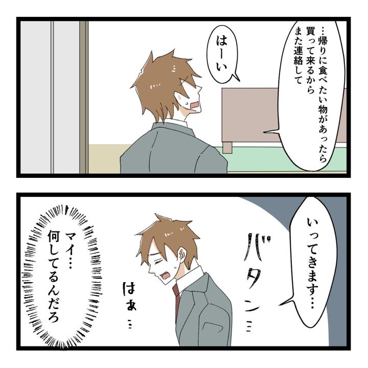 「いってきます・・」と力なく言い、家を出たヒロトさんは、「はぁ・・マイ・・何してるんだろ」とため息をつきながら、マイさんのことを思い出していました。