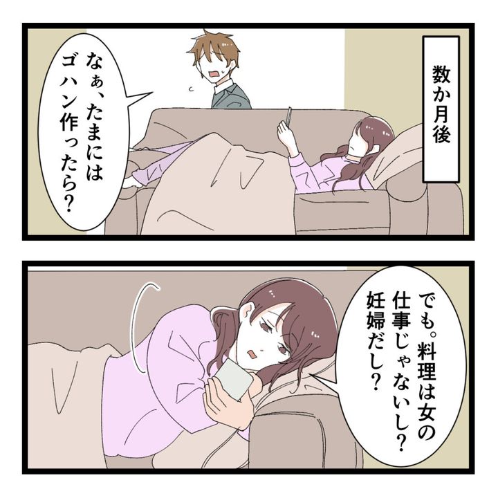 「なぁ、たまにはゴハン作ったら?」ヒロトさんの言葉に「でも、料理は女の仕事じゃないし?妊婦だし?」とソファに横になり全く動く気配のないアユミさん。