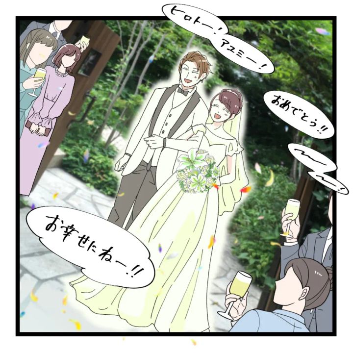 そして、ヒロトさんとアユミさんは結婚式を挙げ、みんなに祝福されました。
