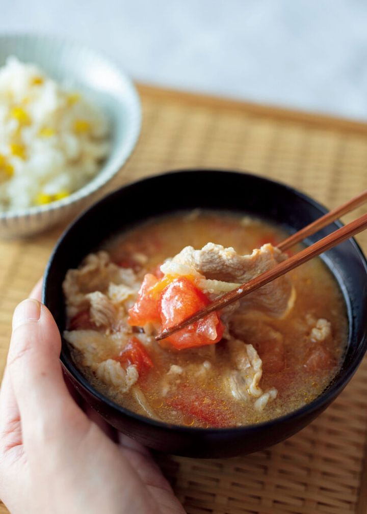 そこで今回、紹介するのが「トマトの甘酒豚汁」。甘酒を加えることでこくが出て、ぐっと奥深い味わいに。トマトで後味がさっぱりするので、暑い時期でも飲みやすい一杯です。