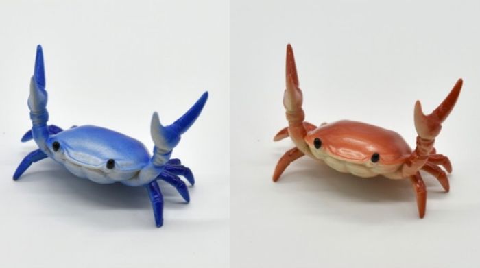 カニの形をしたペンホルダーです。上に振り上げたハサミ脚で、ボールペンなどを挟みます。赤・青のほかにも、豊富なカラーがそろっています。