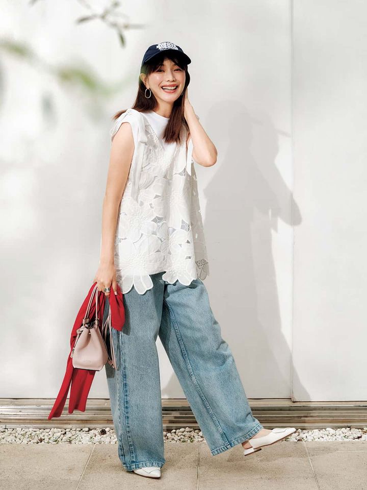 キャミソール¥39,600(venit/ノーブル 有楽町マルイ店)ノースリーブトップス¥11,550デニムパンツ¥47,300〈ともにサードマガジン〉キャップ¥8,800〈ビズ スケートボーズ〉(すべてサードマガジン)手に持ったニット¥49,500(ATON/エイトン青山)バッグ¥152,900(トッズ/トッズ・ジャパン)パンプス¥36,300(ファビオ ルスコーニ/伊勢丹新宿本店 本館2階 婦人靴)ピアス¥39,600(リューク)リング¥68,200(ブランイリス/ブランイリス トーキョー)