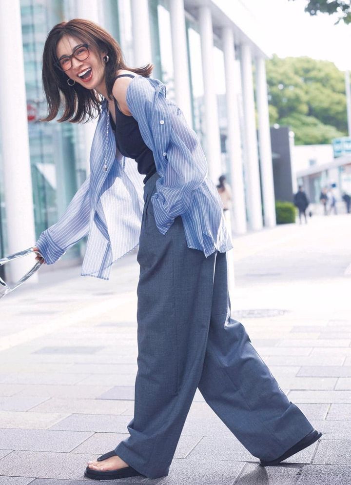 オーガンジーシャツ¥19,910(FRAY I.D/FRAY I.D ルミネ新宿2店)タンクトップ¥17,600パンツ¥35,200(ともにアイレネ/ルシェルブルー総合カスタマーサービス)バッグ¥14,080(バーセルフ)サンダル¥15,400(ワースタジオ/アルアバイル)ピアス¥23,100(ニナ・エ・ジュール/ショールーム ロイト)ネックレス¥75,900(リューク)メガネ¥28,600(ブラン/ライト)