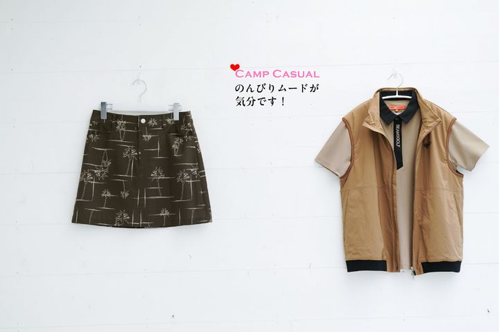 ユニセックスな空気感のアウトドアは、ゴルフシーンではスカートスタイルでスイートにまとめるのが洗練の秘訣。サファリテイストやアクティビティスタイルをきれいめヘルシーにアレンジしつつ、アウトドア小物をオンすると、さらに山や高原に着映えて素敵。ナチュラルにゆったりと時間を楽しむ大人女子の晩夏スタイル!