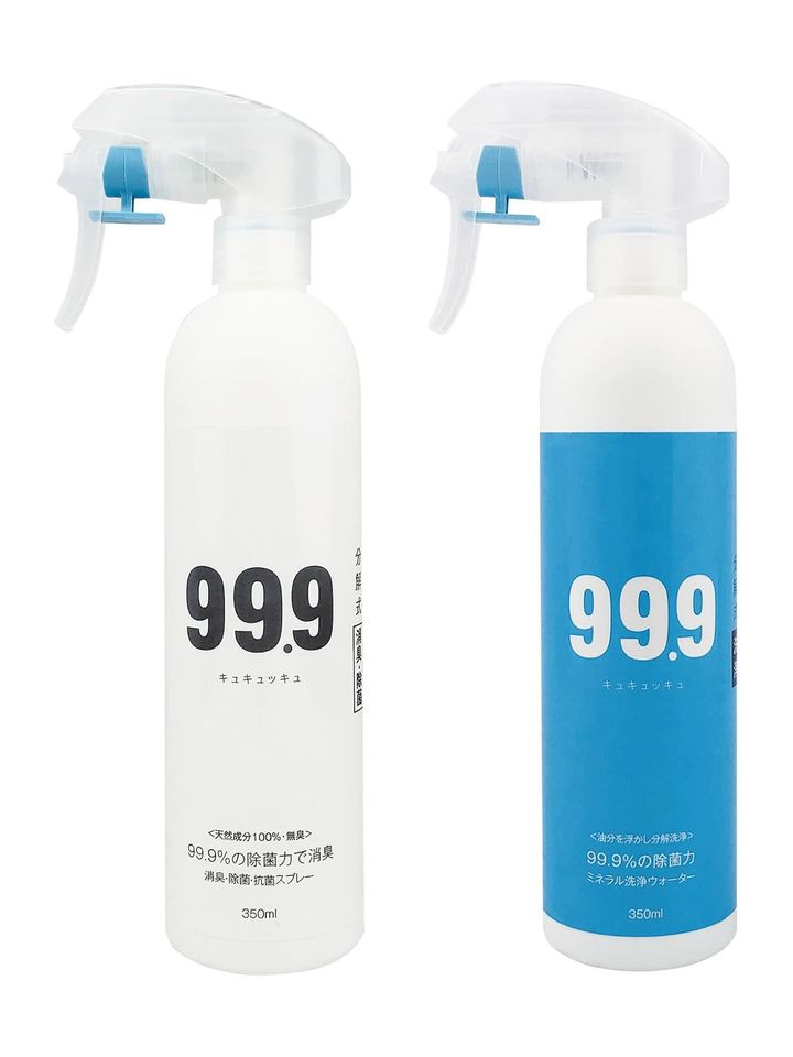 水不足の中で活躍するのが、99.9(キュキュッキュ)の除菌消臭スプレー&洗浄スプレーセット。除菌消臭スプレーはすぐに洗濯できない衣類や寝具に、洗浄スプレーは水洗いしたいものにそれぞれ使い分けることで、清潔な環境を維持できる。天然成分100%なので、敏感肌や赤ちゃんの肌にも安心だ。