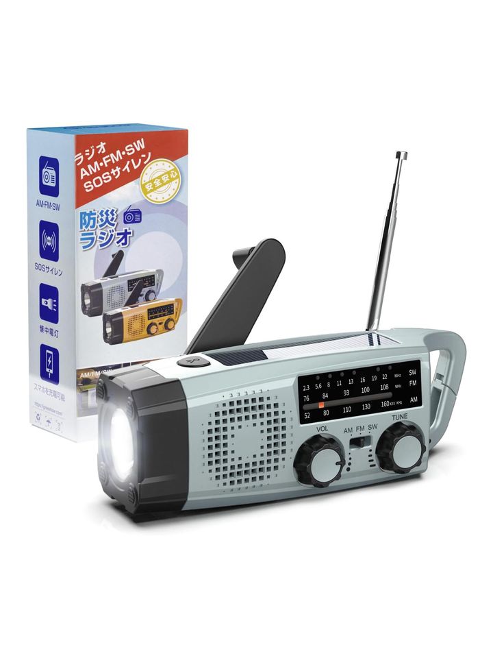テレビやスマートフォンが使えない状況で、情報収集に欠かせないのがラジオ。Greeshowの防災ラジオは、緊急時でも抜群の受信感度を誇る。手回し充電、USB充電、ソーラー充電、内蔵充電池の4WAY充電方式が採用されているので、充電不足の心配もない。さらに懐中電灯やSOSサイレンなど多様に活用できる。