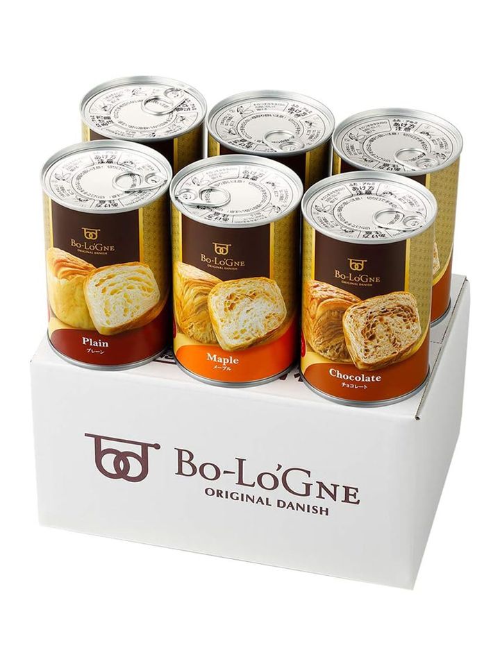 “行列のできる屋台のパン”として有名な京都の人気店から生まれた「缶 de ボローニャ」。シンプルな原材料から作られたデニッシュブレッドは、プレーン、チョコレート、メープルの3種類がセットになっている。1つ100gと軽量な上、缶切りが不要なのでもしもの時にも安心。