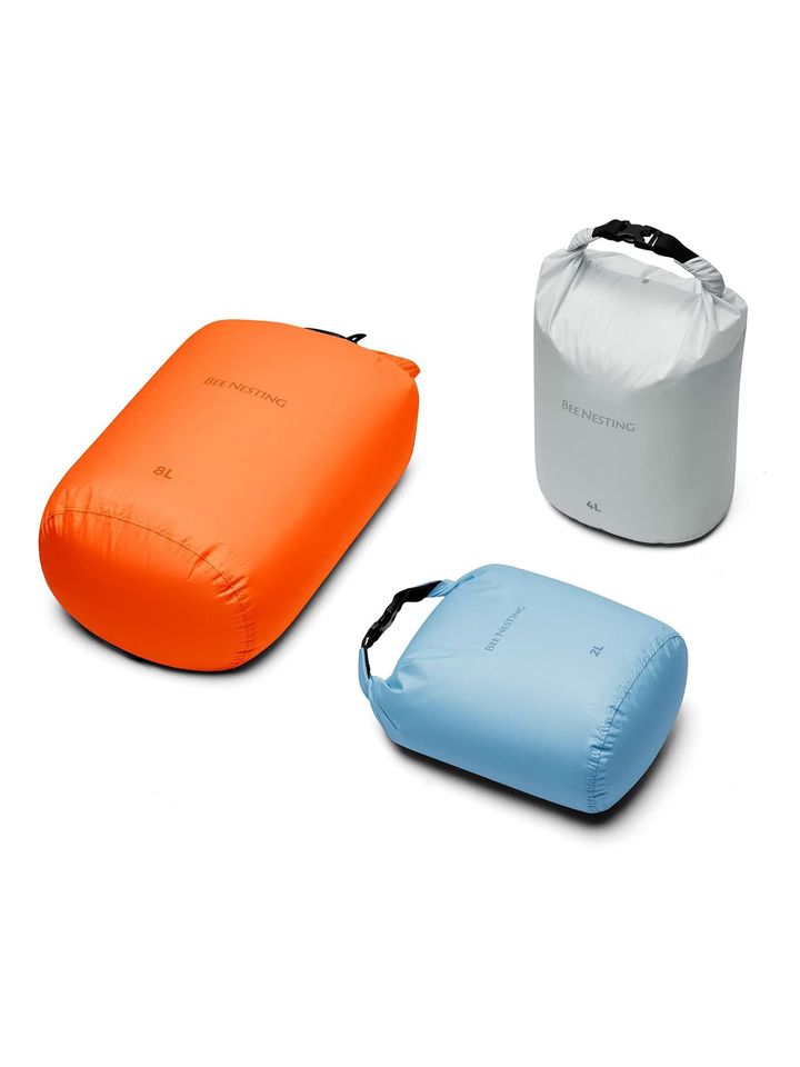 とにかく軽く、防水性も兼ね備えたBee Nestingのドライバッグセット。雨や浸水からも中身をしっかり守ってくれるので、貴重品や衣類、書類などの濡らせないものを持ち運ぶのに最適だ。半透明の生地で、中身の確認がしやすいのもうれしいポイント。2L、4L、8Lの3サイズ展開。