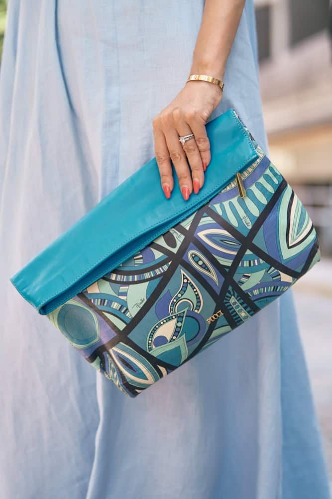 パープルのパイピングとグリーンのバックアクセントが印象的なMYLANのワンピースは、この夏のお気に入り。上質なリネン素材で、着心地も快適です。クラッチはあえてプッチの華やかなデザインをアクセントに。ワンピースの色合いを引き立てるよう、羽織りには同系色のラルフのシャツを合わせました。