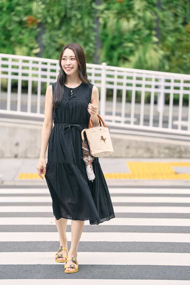 リボンやティアードがほどよい甘さで、ラクなのにしっかり可愛いユニクロのワンピースは、着るだけでコーデが完成。足元は鮮やかなイエローのサンダルでパッと明るく、ご近所でも映える差し色に。馬モチーフのバッグで遊び心を添えて、気取らずに着られる大人の夏カジュアルコーデです。