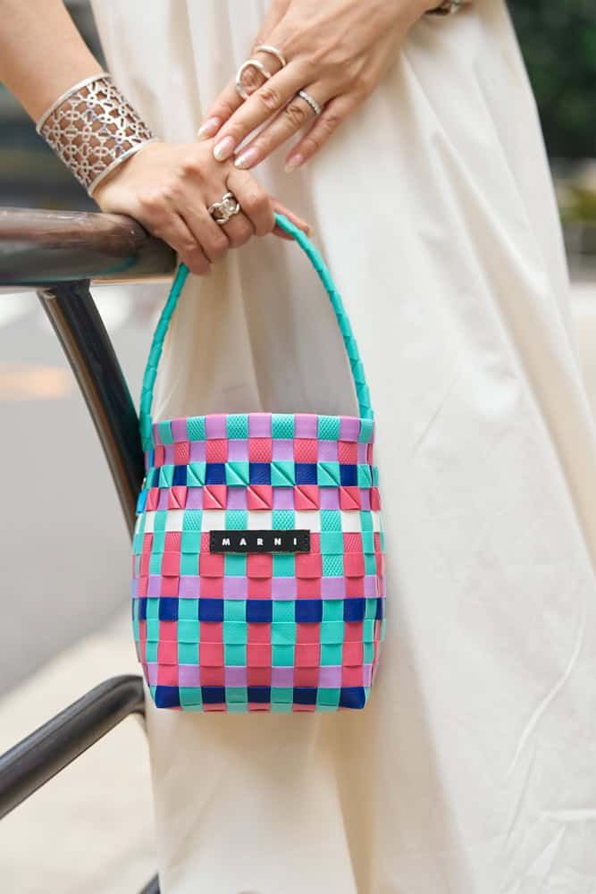 裾に広がるバルーンシルエットが魅力のワンピース。アメリカンスリーブが程よくヘルシーな印象にしてくれます。真夏の暑さにもぴったりな爽やかな白を選びました。バッグはマルニのキッズラインのもので、カラフルな色使いが元気をくれるうえ、意外に収納力もあり、雨や湿気の多い日にも安心して使える万能アイテム。ワンピースがシンプルなので、アクセサリーは大ぶりなシルバーをチョイス。帽子やサンダルの存在感もプラスしコーデに奥行きを持たせています。