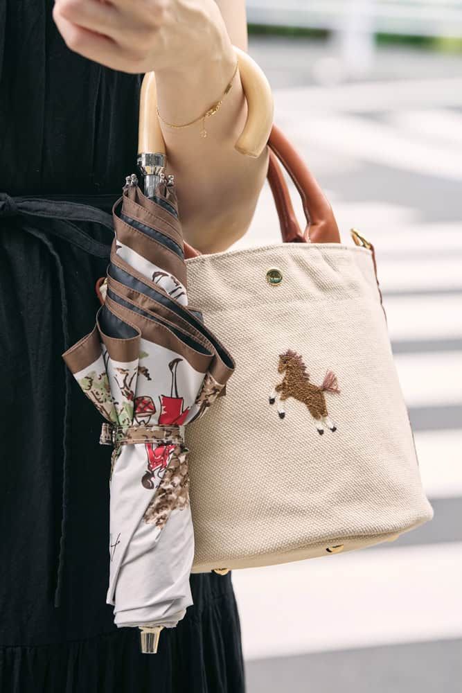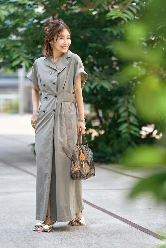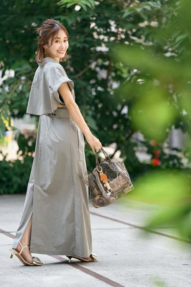 トレンチ風のワンピースは、裾の広がりや印象的なバックデザインが魅力。背中はケープデザインになっていて、ちらりとのぞく素肌がヘルシーな抜け感が出せます。PVC素材で夏らしいバッグはウサギの耳がついていてさりげない可愛さを。落ち着いたブラウンカラーが大人っぽさを意識しつつ、大きなリボンが目を引くサンダルで華やぎを添えれば、ご近所でも浮かない夏の上品可愛いコーデが完成します。