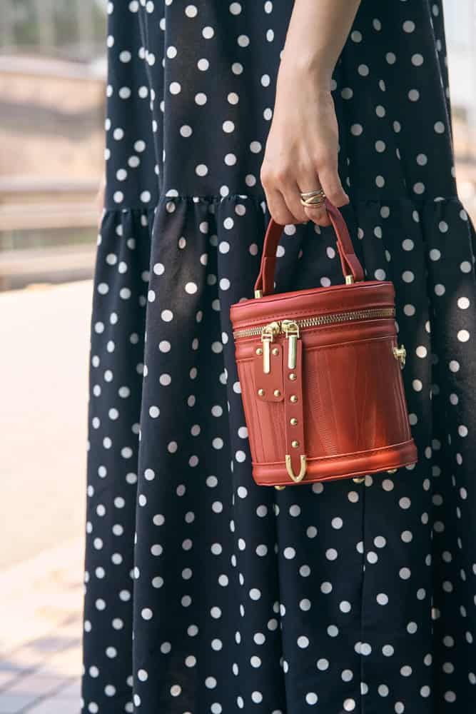 ドットワンピースはとにかく楽ちんなのに、涼しく一枚で華やか見えするので、夏の暑い日やコーデに迷った日の救世主!赤のバッグを差し色に入れるだけで、ぐっと可愛さもアップします。足元は走れるサンダルで動きやすさを。ご近所でも気軽に楽しめる、カジュアルコーデに仕上げました。