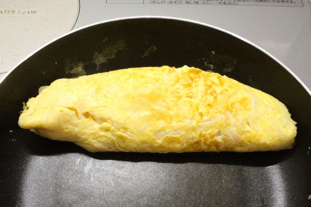 しゅんまるさん考案の「麺麺たまご焼き」が完成!そうめん入りの溶き卵を焼きましたが、表にそうめんのシルエットは出ず、プレーンオムレツのように仕上がりました。