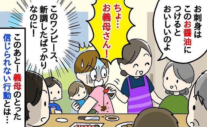 夫の親戚が一堂に会する大きな集まりでのこと。小さな子を抱えながら、やっと席についたそのとき、義母が私の皿に醤油を注ごうとして──新調したワンピースの上にドボドボと……。偶然のハプニングなのか、それとも別の思惑があったのか。あの日から私の胸にはモヤモヤが残っています。