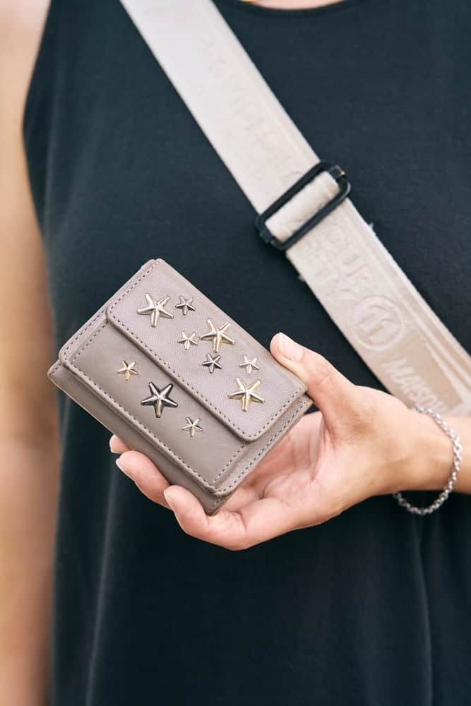 母からのプレゼントでもらったジミーチュウの定番、星形スタッズが印象的な財布。最近はコンパクトなバッグを持つことが増えたため、三つ折りながらも厚みが出にくいこのデザインがお気に入りで、日常的に愛用しています。