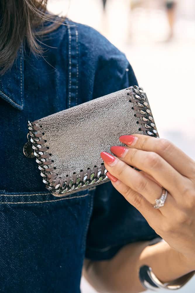 長財布とミニウォレットはシーンやバッグによって使い分けています。長財布はシンプルですが、ミニウォレット小さい分ちょっと遊び心のあるものを選びます。素材とキラッとしたチェーンが目を引くStella McCartneyのお財布。お札も小銭もカードも名刺も入り見た目以上の収納力で大活躍しています。