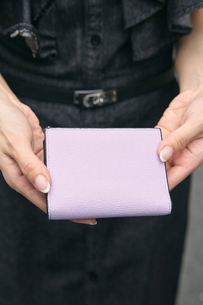 ヴァレクストラのお財布は、レアカラー・ラベンダー色に一目惚れ。二つ折りのコンパクトサイズで、小さめバッグにもすっきり収まり、見た目も使い勝手も推しな逸品です。