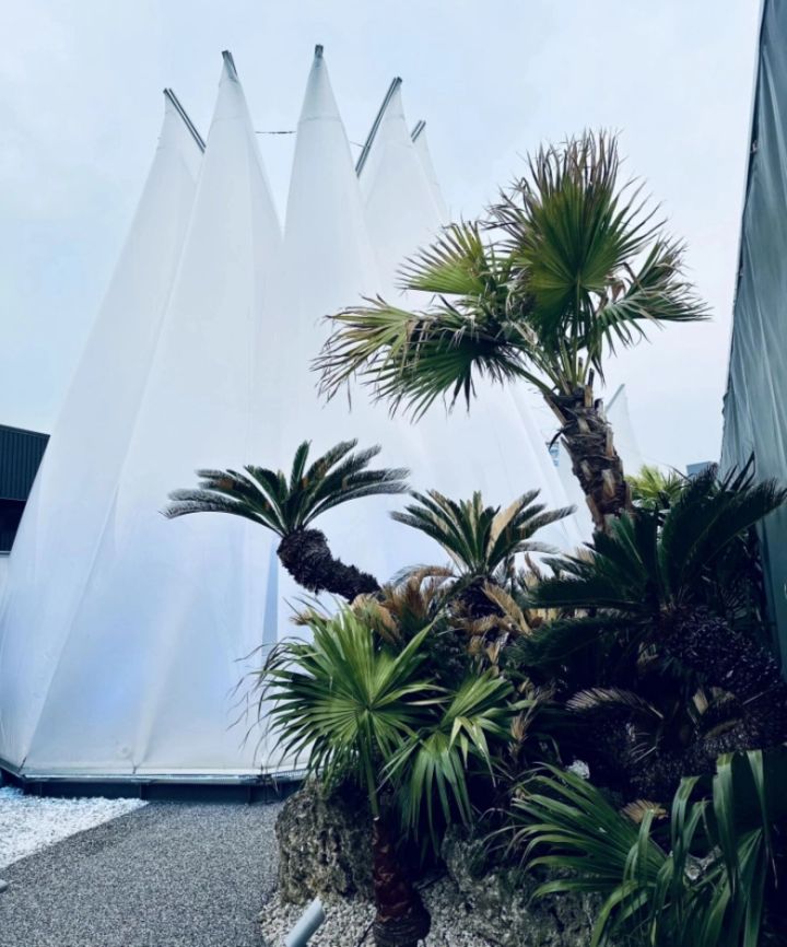 『太陽のつぼみ』は太陽工業株式会社が中心となって展開するパビリオンです。太陽工業は「膜」を生産する会社で、有名なところでは東京ドームの天井の膜や、今回の万博の会場のある夢洲駅、最近では高輪ゲートウェイなど、普段、私たちが生活する中で知らず知らずのうちに快適空間を作ってくれているのが太陽工業です。