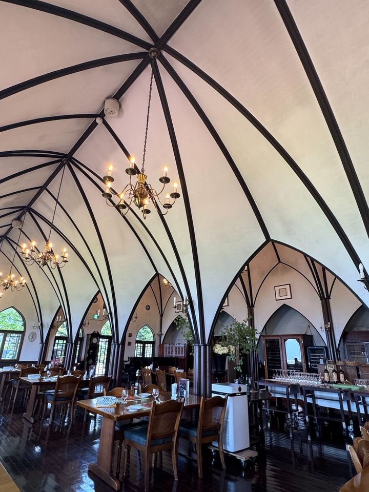 ランチは、勝沼醸造が手がける直営レストラン「レストランテ“風”」で。結婚式の披露宴も行われるモダンな空間は、天井が高く開放感たっぷり♡ のどかな風景と広がるぶどう畑を眺めながら、ゆったりとした時間が流れます。