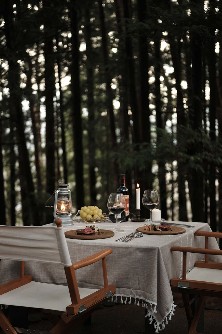 1日の締めくくりは、「星のや富士」での「葡萄ペアリングディナー」。まるで森全体が自分のプライベート空間になったかのような特等席で特別なディナーを味わえます。