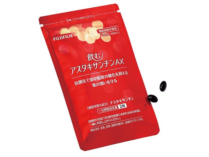 抗酸化作用のあるアスタキサンチンで肌ダメージを軽減。活性酸素の働きを抑え、うるおい保持をサポート。飲むアスタキサンチンAX【機能性表示食品】60粒入り ¥5,184/富士フイルム