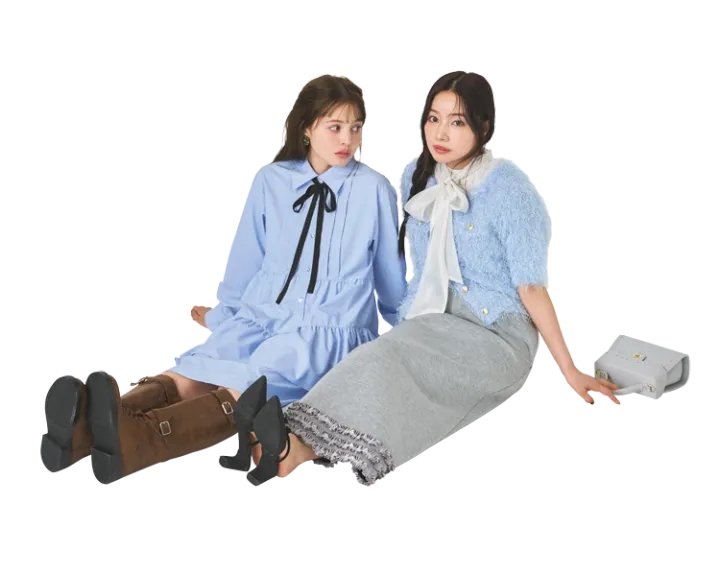 〈左・ナナ〉ティアードワンピース 15,950円/JILL by JILL STUART イヤリング 16,740円/アビステ ブーツ 15,900円/チャールズ&キース(チャールズ&キース ジャパン)〈右・サエ〉フリンジノーカラージャケット 11,990円、ボウタイブラウス 11,880円/ともにJILL by JILL STUART スエットスカート 19,800円/The Girls Society バッグ 15,950円/ダイアナ(ダイアナ 銀座本店)ミュール 8,910円/RANDA