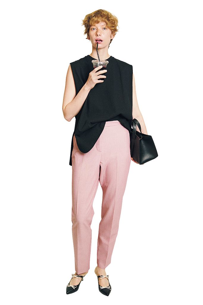 ピンクパンツは着まわし。黒タンクトップ/サクラ(インターリブ) 黒バッグ/アレスタジオ(ギャルリー・ヴィー 丸の内店) 黒リボンミュール/ダイアナ(ダイアナ 銀座本店)