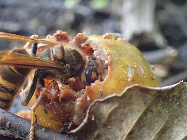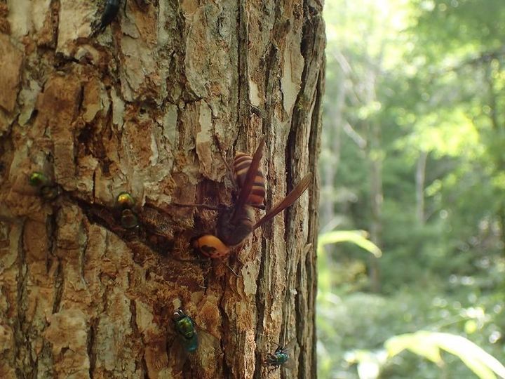 他の虫たちと一緒に樹液を舐めるオオスズメバチ