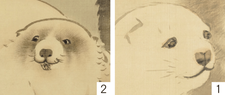 「応挙は目の輪郭を薄い墨を重ねて描くことで、うるうるしたけなげな表情になっています。芦雪は濃い墨で描くことで、やんちゃでユーモラスな印象に」