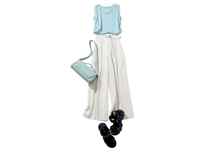 ノースリーブTシャツ¥7,480/Stola. ワイドパンツ¥12,100/31 Sons de mode(ダブルエー) 横長バッグ¥8,250/カカトゥ(アンビリオン) スポーツサンダル¥8,800/オリエンタルトラフィック(ダブルエー) パールネックレス¥16,500/ステラハリウッド